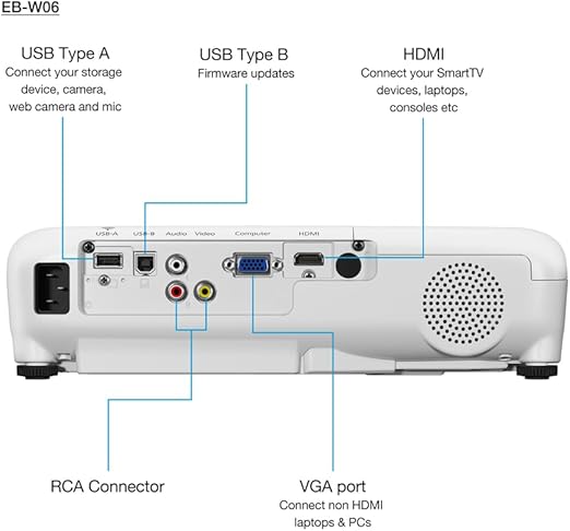 Epson EB-W06 portable LCD projector with multiple connectivity options including HDMI, USB, and VGA.